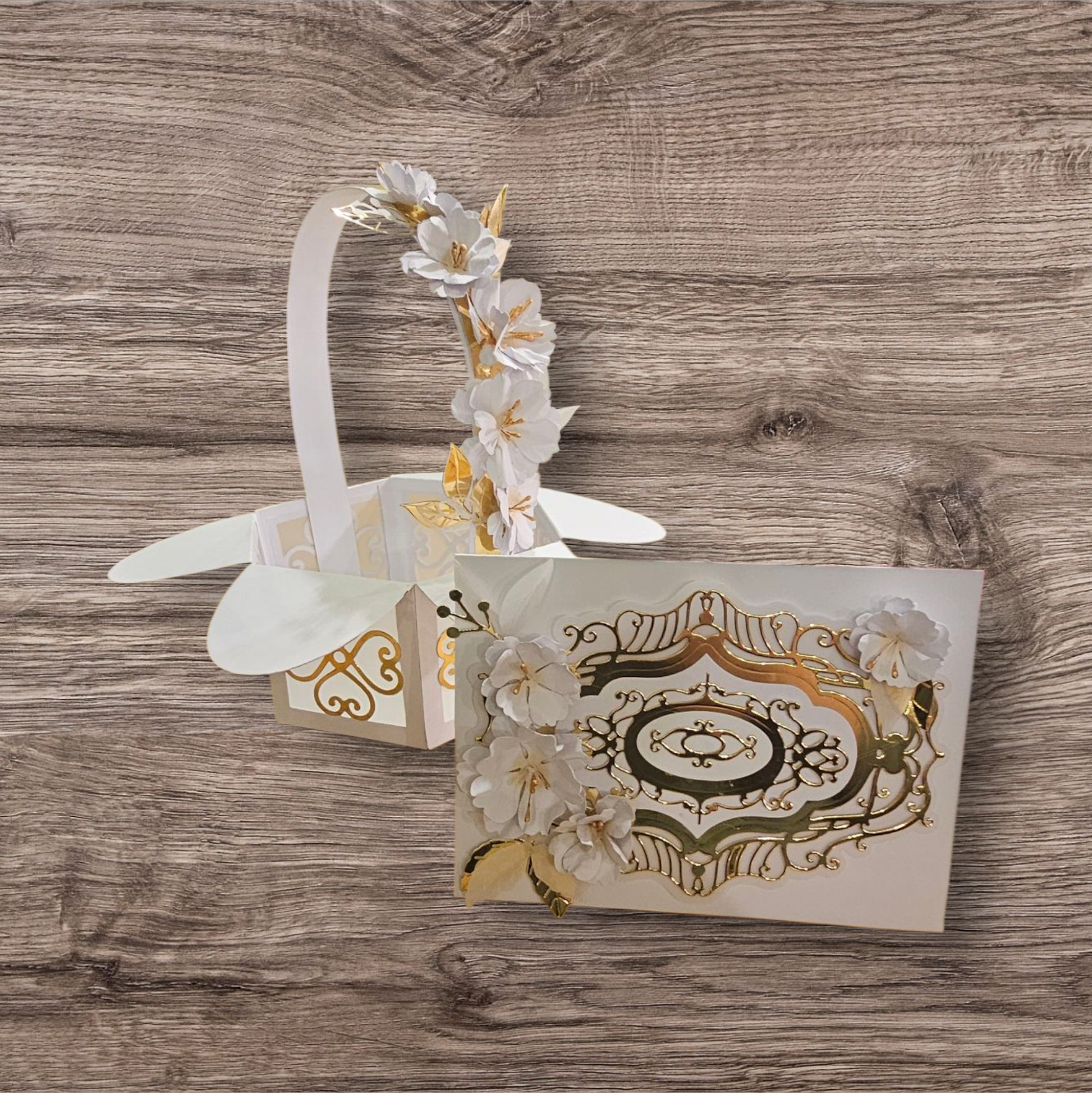 🌸 Create a matching card featuring intricate gold accents and layered flowers.
