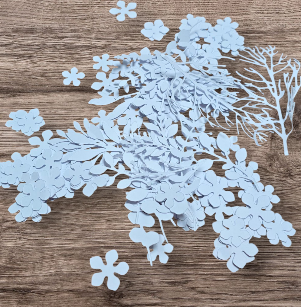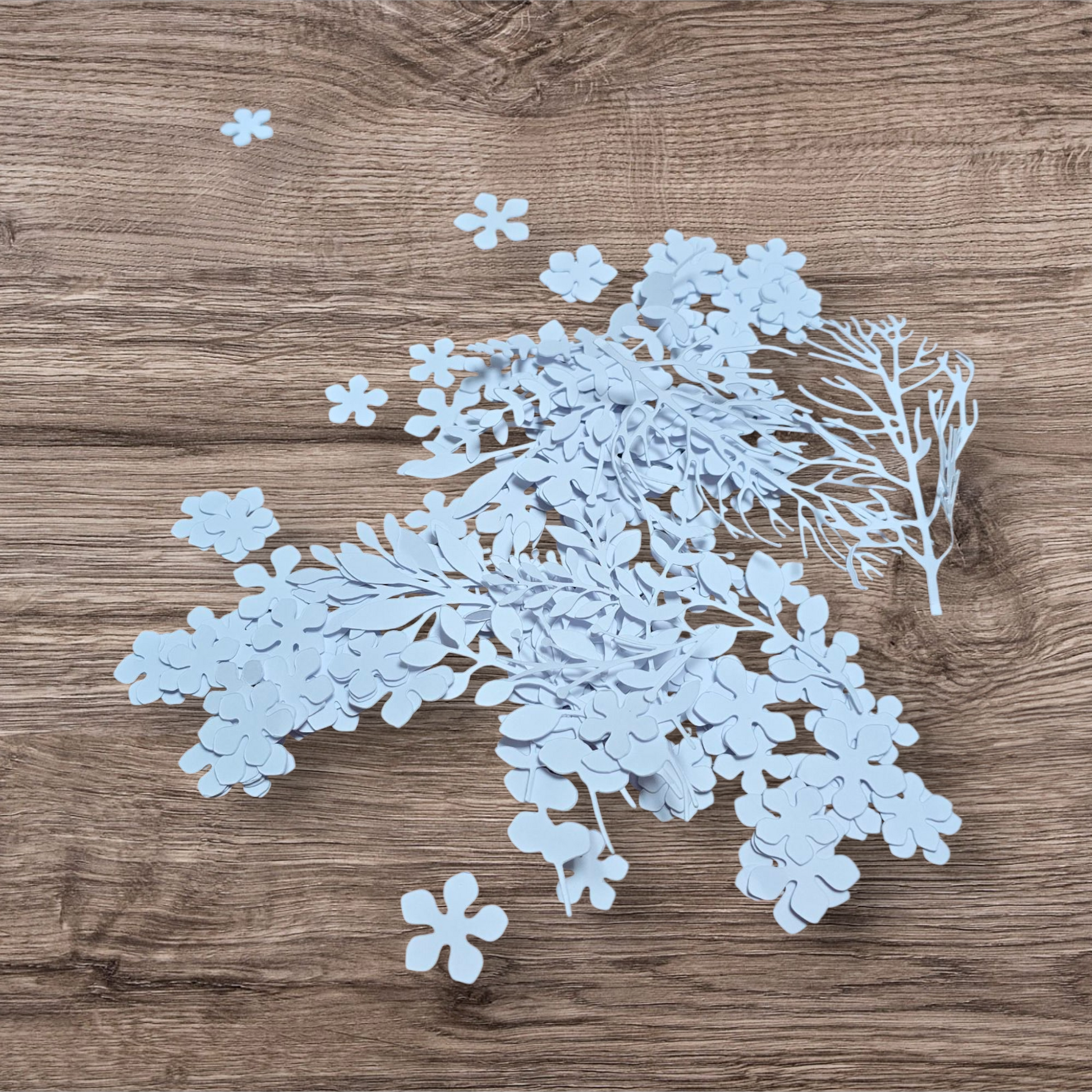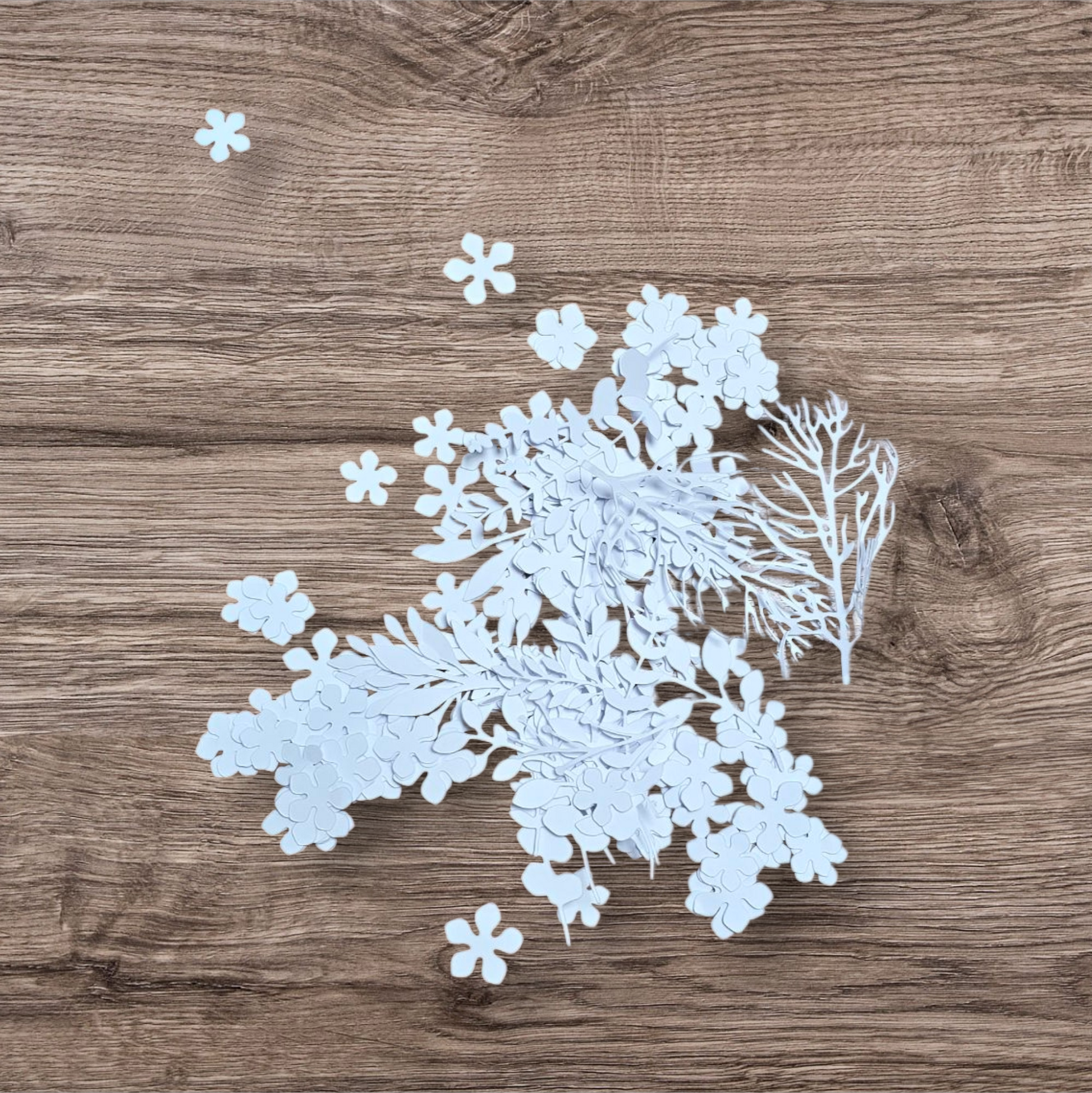 Each pack offers over 150 intricately cut pieces, featuring a timeless flower design in three sizes alongside a variety of delicate leaf shapes.