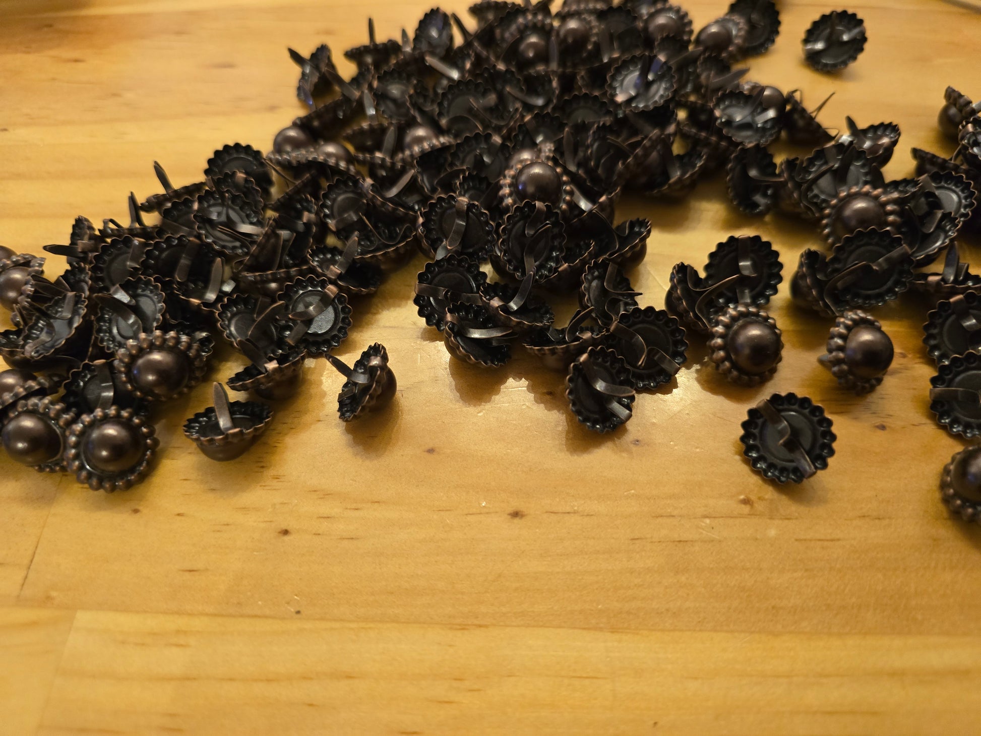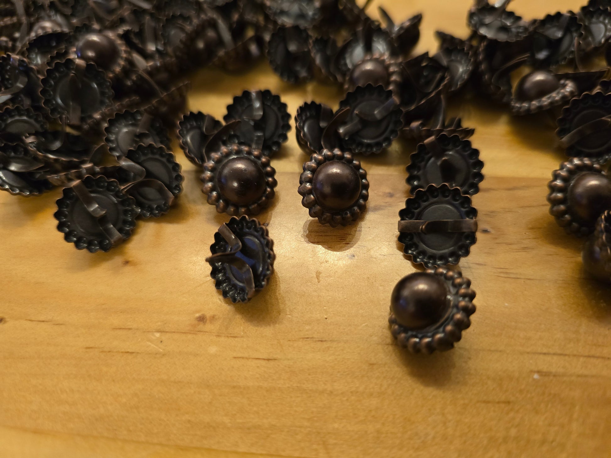 Decorative metal brads with a scalloped flower edge and rounded dome center, finished in warm antique copper/bronze. Each fastener measures about 5/8 inch, or roughly 15 mm across, making them a perfect accent for cards, scrapbooks, mixed media, or stitch‑and‑paper craft projects. Use them to add vintage flair, secure layers, or create tiny focal points on embellishments; the split prongs fold behind the paper, giving a neat, lasting hold. Great when you want a rustic, antique look without bulky hardware—works well on cardstock, chipboard, thin leather, or fabric layers.