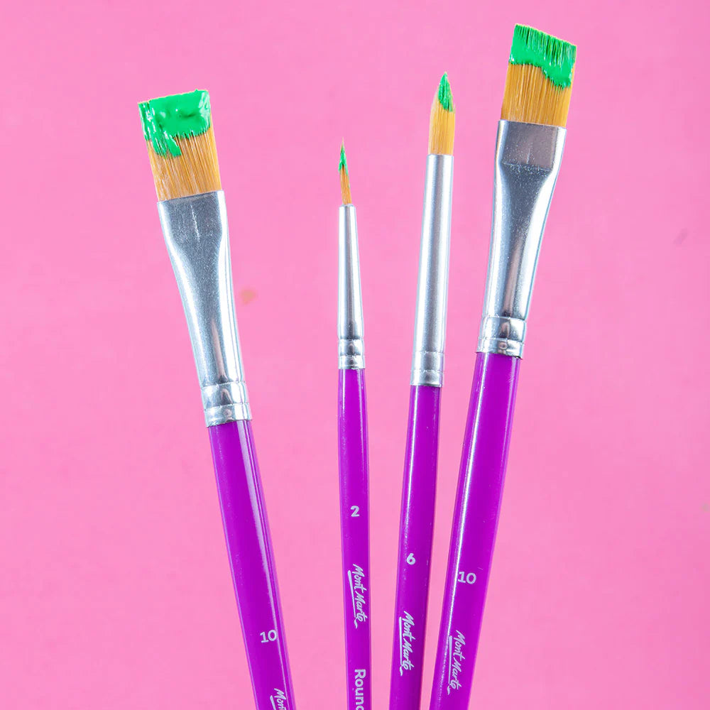 Whether you’re just starting out or are looking for a mixed bag of all-rounders our Assorted Brush Set 4pc has you covered. Inside this art brush set are a flat, angle and two round brushes, ranging in sizes from 2 -10. These trusty tools feature soft taklon bristles and aluminium ferrules to last you many creative sessions. Use these versatile paint brushes on a range of mediums including acrylic, poster and oil paints. Grab a mixed brush pack and get stuck into your next art or craft project.
