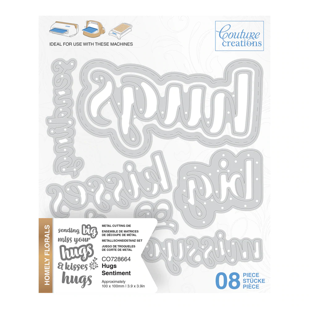 Add graceful and elegant diecut sentiments to your next fabulous cardmaking or scrapbooking projects with this 'hugs' themed cutting die set from the Homely Florals collection by Couture Creations.