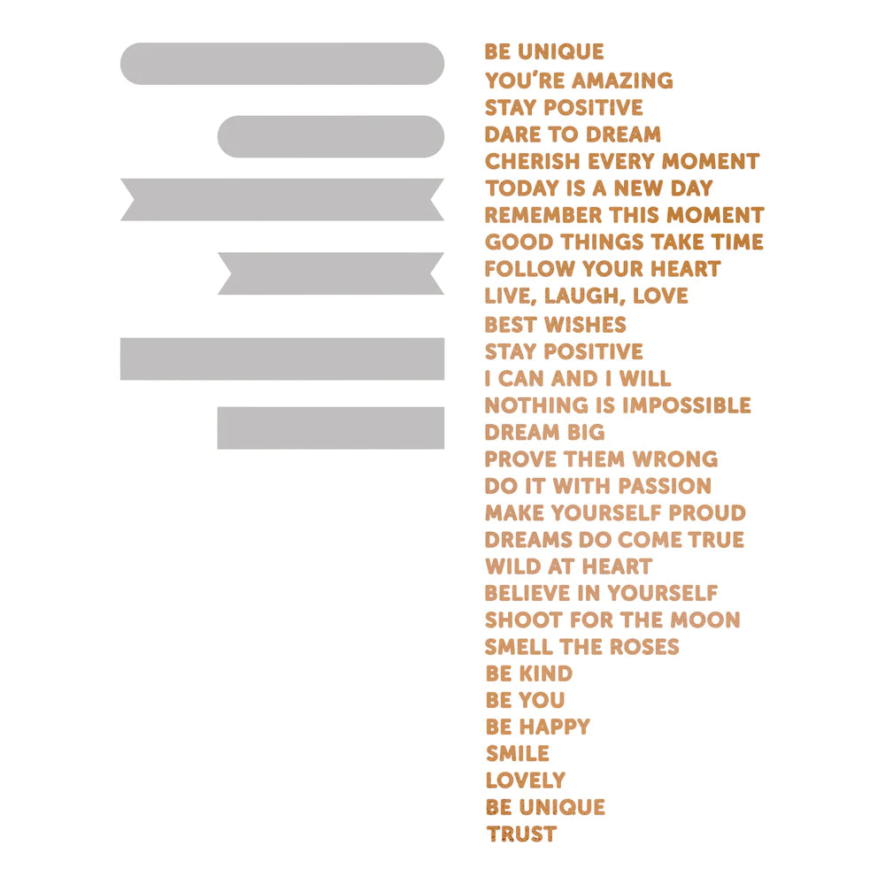 Create labels with the perfect sentiment with this stamp and die set. Includes 6 labels and sentiments 'Be Unique', 'Do It With Passion', 'Good Things Take Time', 'Dream Big' and many more.