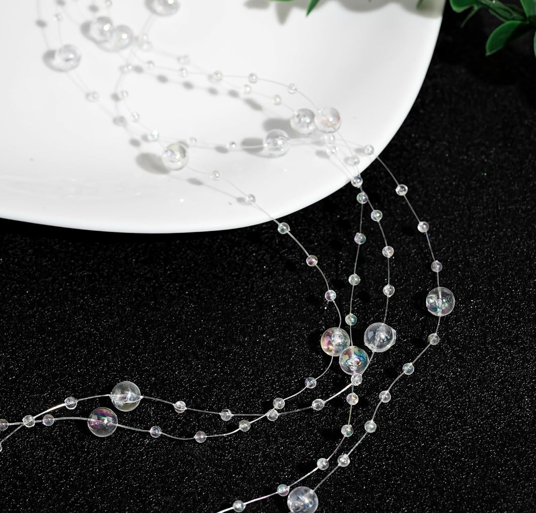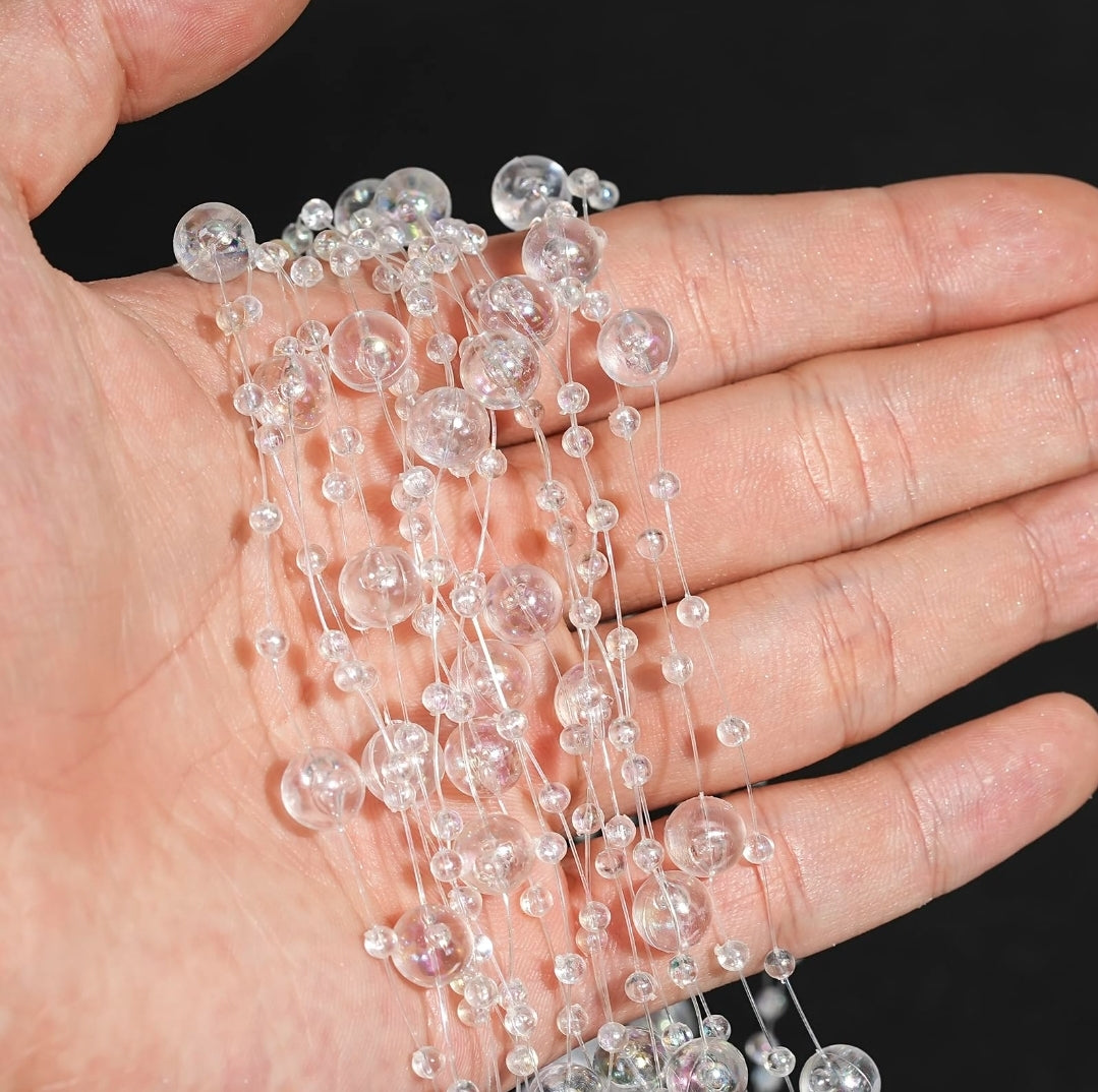 Decorative beaded string made of transparent, iridescent acrylic beads of varying sizes, connected by thin, transparent string. The beads have a bubble-like appearance with a subtle rainbow reflection, giving them a shimmering and elegant look.
