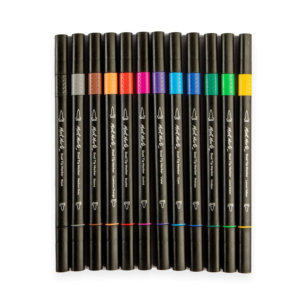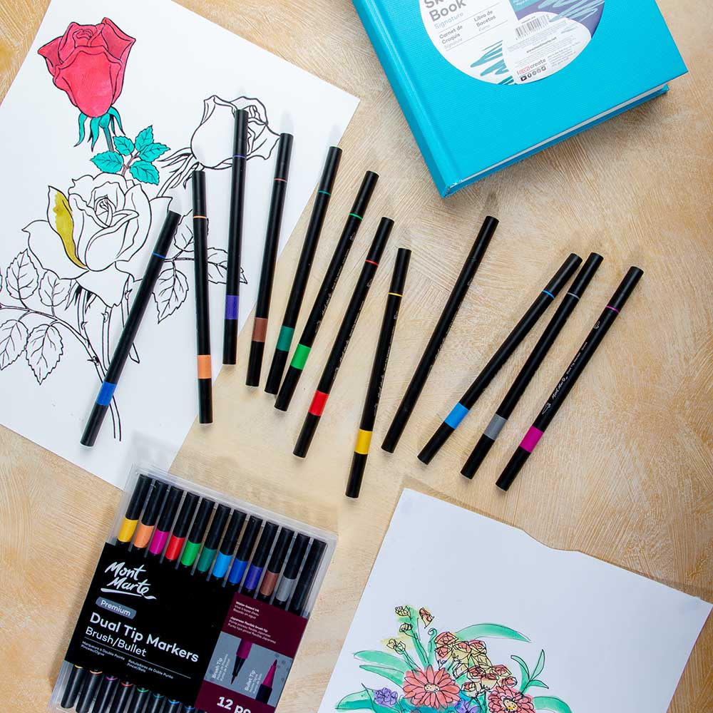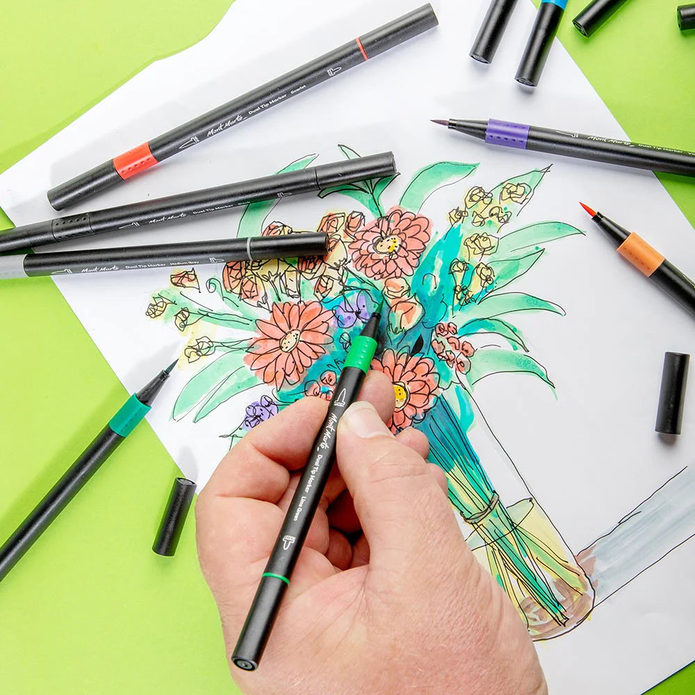 Our Dual Tip Markers 12pc have a brush tip on one end and a bullet tip on the other, making them a great go-to for drawing, lettering and journalling. Inside the set are 12 vibrant water-based colours with dual tips that give you the freedom to create a variety of strokes. This dual art marker set offers a high-quality brush and bullet tip, along with an ergonomic tri-grip pen barrel to keep you comfortable during long creative sessions. Grab these professional-grade art markers today to make your mark!