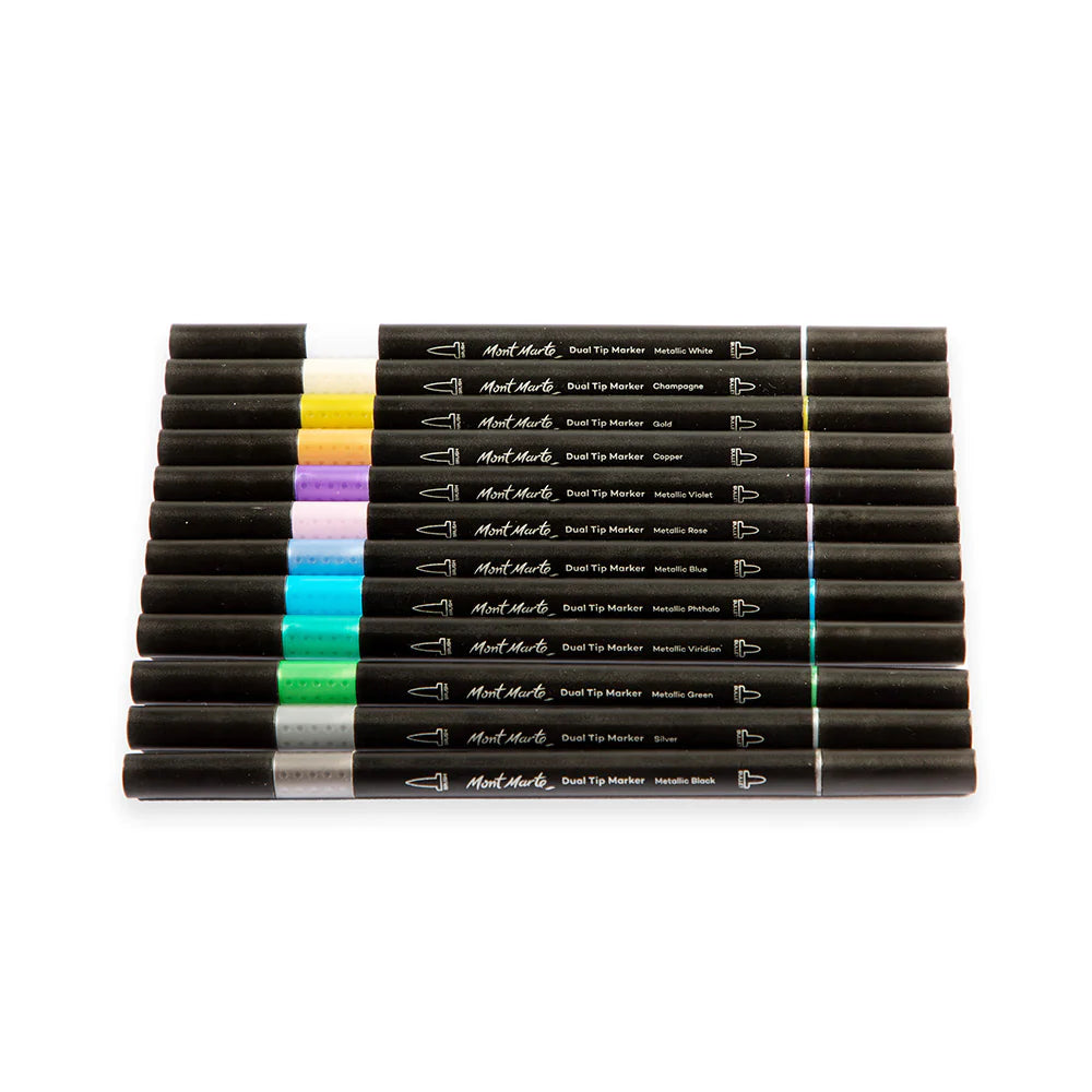 Our Dual Tip Markers Metallic 12pc have a brush tip on one end and a bullet tip on the other, making them a great go-to for drawing, lettering and journalling. Inside the set are 12 metallic water-based colours with dual tips that give you the freedom to create a variety of strokes. This dual art marker set offers a high-quality brush and bullet tip, along with an ergonomic tri-grip pen barrel to keep you comfortable during long creative sessions. Create some stunning effects with these metallic professional grade art markers today!