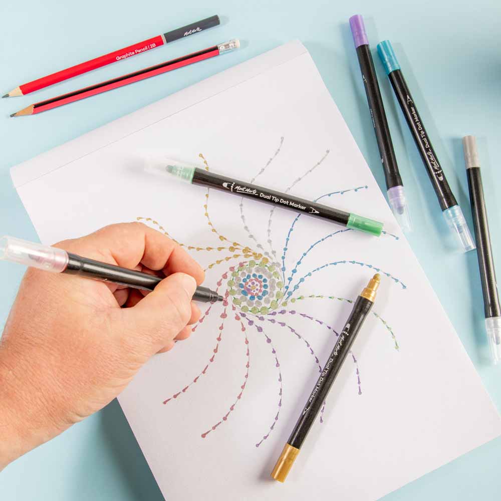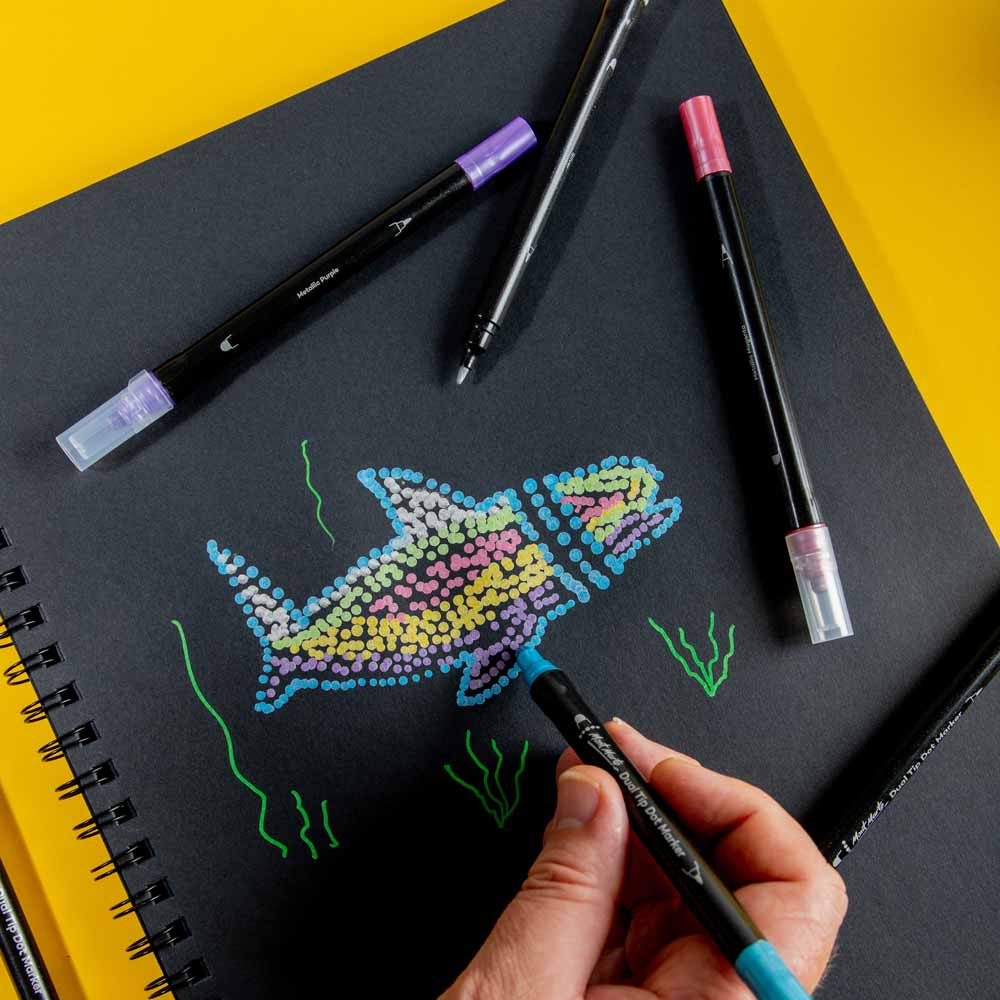 Create shimmering patterns and designs with our Metallic Dot Marker Dual Tip 6pc. This set comes with 6 metallic colours that will make your artwork or journaling stand out! These dual tip markers offer a 0.4mm fine tip, plus a 5mm round tip, giving you the freedom to create precise lines and dot work. You'll also find these art markers are water-based, making clean up a breeze. If you're ready to dot the day away and create some stunning work, this set has you covered!