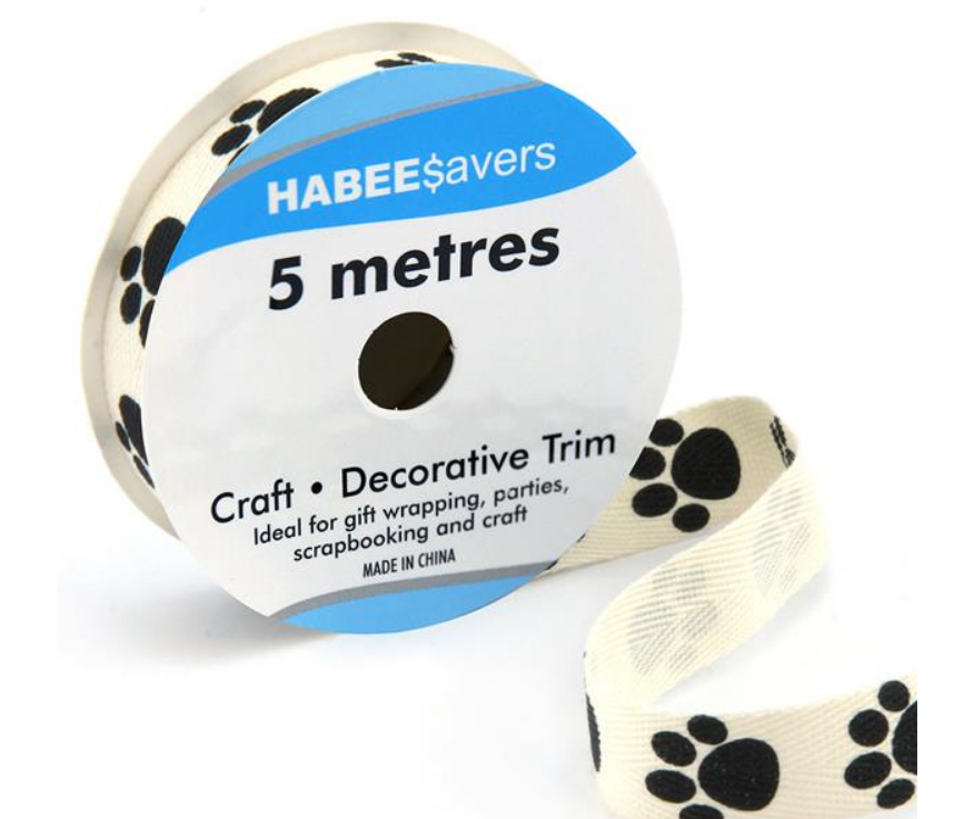 PRINTED COTTON RIBBON 15MM X 5M 100% COTTON, paw print on natural