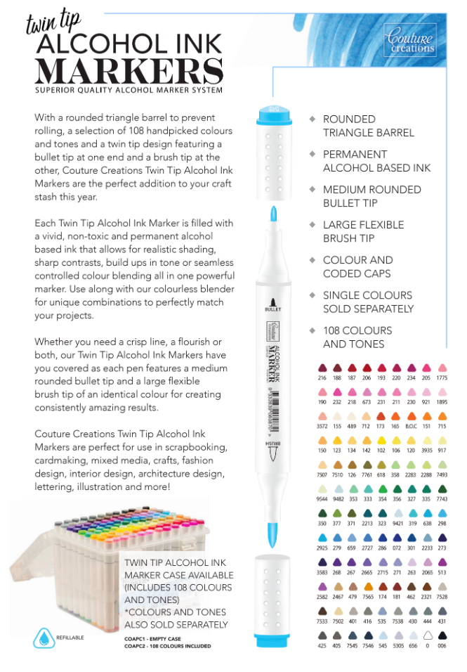 Couture Creations Twin Tip Alcohol Ink Markers are perfect for use in scrapbooking, cardmaking, mixed media, crafts, fashion design, interior design, architecture design, lettering, illustration and more!