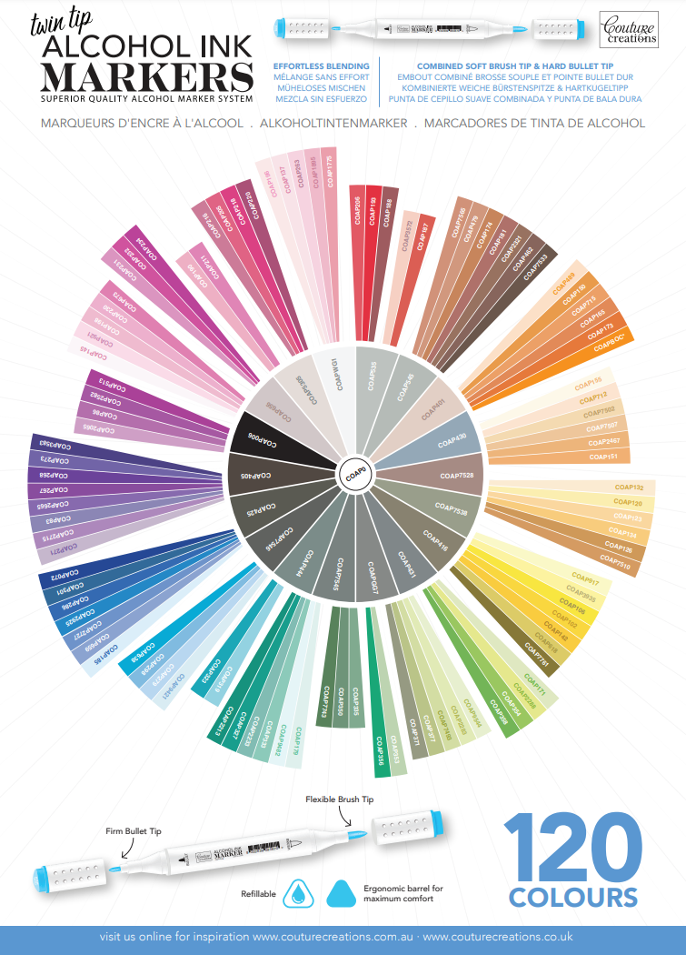 With a rounded triangle barrel to prevent rolling, a selection of 120 handpicked colours and tones and a twin tip design featuring a bullet tip at one end and a brush tip at the other, Couture Creations Twin Tip Alcohol Ink Markers are the perfect addition to your craft stash this year.